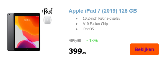 Want hoewel 18% geen enorm hoge korting is, vertaalt dat zich in het geval van de iPad 7 naar € 89,05 korting op de adviesprijs van € 489,-. Een snel rekensommetje leert ons daarmee dat je de Apple iPad 7 128GB daarmee voor € 399,95 krijgt. Maar wel enkel vandaag én enkel hier.