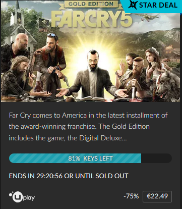 Daarom is de Gold Edition van Far Cry 5 op dit moment de Star Deal van de website, hetgeen betekent dat je extra veel korting krijgt. Deze versie van het spel kost je normaal € 89,99, maar is nu 75% goedkoper, waardoor je al voor € 22,49 klaar bent. Maar let op: deze deal loopt nog maar 29 uur óf tot het vooraf bepaalde aantal keys op is. Wacht dus niet te lang.