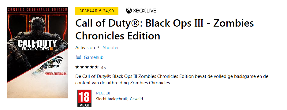 Natuurlijk vind je CoD: BO3 tegenwoordig bij elke winkel al tegen een gereduceerd prijsje, maar dan zit je wel met een fysiek exemplaar. En er schijnen mensen te zijn die daar niet zo gelukkig van worden. Deze mensen zullen verheugd zijn om te leren dat je tot het eind van de week maar liefst 50% korting op de game krijgt op Xbox Live. Je betaalt hierdoor geen € 69,99, maar € 35,-. Omdat je iets over moet hebben voor het gemak zeggen we dan maar.