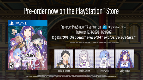 Spike Chunsoft heeft onthuld dat gamers die Re: ZERO: The Prohecy of the Throne pre-orderen op PlayStation Network mogen uitkijken naar digitale extra's en een kleine korting.