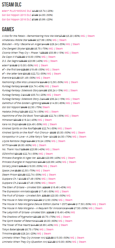 Websites als MangaGamer, die vrijwel uitsluitend games vanuit Japan verkopen, organiseren namelijk vaak Golden Week sales. Ook dit jaar. Hieronder kun je een lijst vinden van alle spellen die de uitgever heeft afgeprijsd op Steam én diens eigen website, al moet je hier klikken om daadwerkelijk de links te kunnen benutten.