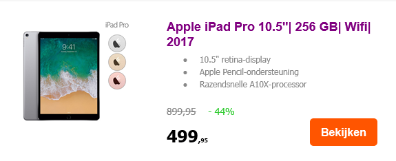 Dat is alle reden die wij nodig hebben om te schrijven over korting op de Appel iPad Pro 10.5''. Dit premium apparaat komt namelijk normaliter ook met een premium prijskaartje. € 899,95 betaal je voor een 256GB model! Maar daar gaat enkel vandaag 44% vanaf op iBOOD.