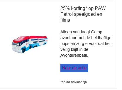 Daarop wijzen wij graag op de sale van Paw Patrol-speelgoed op Bol.com. Enkel vandaag krijg je 25% korting op het gehele assortiment, zoals speelgoedauto's, puzzels en kleurboeken. De recent verschenen Paw Patrol: On A Roll-game zit er echter helaas niet bij.