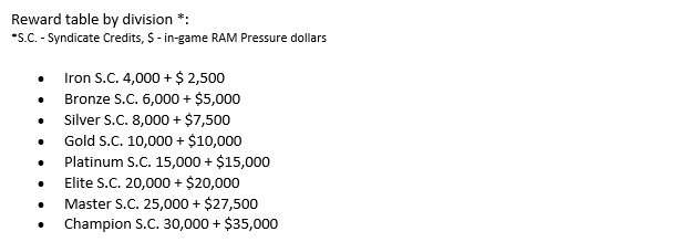 Het idee van Syndicate Credits is dat spelers die meer tijd spenderen en beter presteren de mogelijkheid krijgen om zichzelf te verbeteren. Daarom is deze valuta enkel in-game te verdienen door gevechten te spelen en een goede ranking te verkrijgen. Sterker nog: iedereen die heeft deelgenomen in het eerste seizoen krijgt nu beloningen aan de hand van onderstaande tabel: