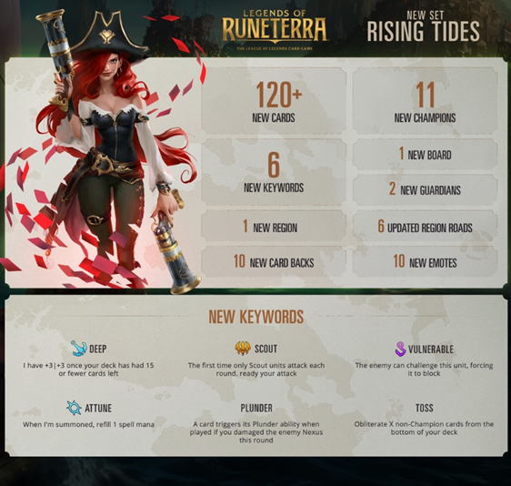 Rising Tides introduceert zestig kaarten voor Bilgewater, evenals zestig kaarten voor de bestaande regio's. Dat zijn dus maar liefst 120 nieuwe mogelijkheden om je vijanden te slim af te zijn. Maar zelfs daar stopt de pret niet. Bilgewater introduceert vijf nieuwe kampioenen en brengt een nieuwe kampioen naar elk van de zes bestaande regio's én introduceert zes nieuwe sleutelwoorden: Attune (zorgt voor meer mana), Scout (sla als eerste toe), Vulnerable (dwingt vijanden een unit aan te vallen), Plunder (schade aan de vijandelijke Nexus), Deep (vertraag je vijand) en Toss (bedoeld om Deep te bewerkstellingen).