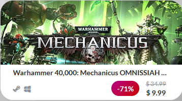 Ons oog werd dan ook al snel naar de nieuwe Crackerjack deal van Indie Gala getrokken. Hierin krijg je de Omnissiah Edition van Warhammer 40,000: Mechanicus met maar liefst 71% korting! Effectief betekent dit dat de prijs van $ 34.99 keldert naar $ 9.99, al is dit wel slechts enkel dit weekend óf tot de keys op zijn. Dus wacht niet te lang met naar deze pagina gaan.